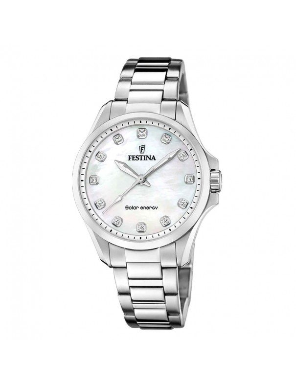 Reloj Festina Solar para mujer F20654/1. Es un modelo auto recargable mediante energía solar, con cristal mineral y esfera de 34 mm de diámetro. La pulsera es de acero con cierre de doble pulsador. Es sumergible a 5 ATM y tiene tres años de garantía.