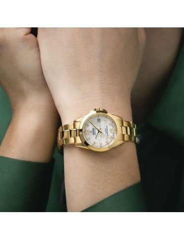 Reloj Festina Swiss de Mujer F20050/1 de acero inoxidable. Esfera de zafiro con tres agujas y diámetro de 29,5 mm. Correa de acero dorado y con cierre desplegable. Marca horas, minutos y segundos a la par que la fecha. Sumergible a 10 ATM. Garantía de tres años.