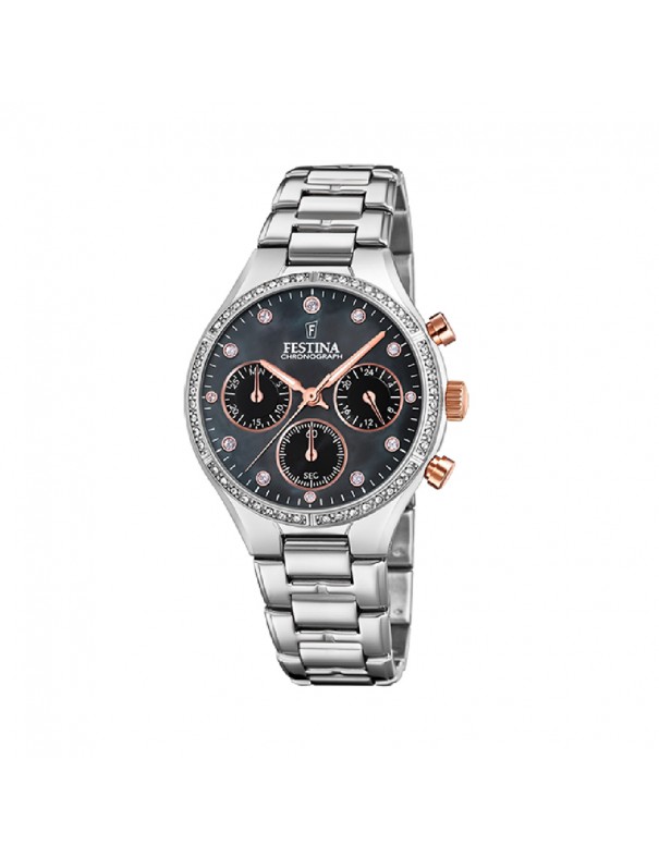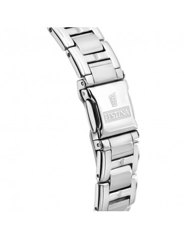 Reloj Festina Boyfriend Mujer F20401/4. Caja plateada de acero de 36mm de diámetro con esfera azul oscuro y agujas y pulsadores en color rosado bajo cristal mineral. La correa es de metal y cuenta con cierre de pasador. Tiene función de cronógrafo. Sumergible hasta 5 bares. Garantía de 3 años.
