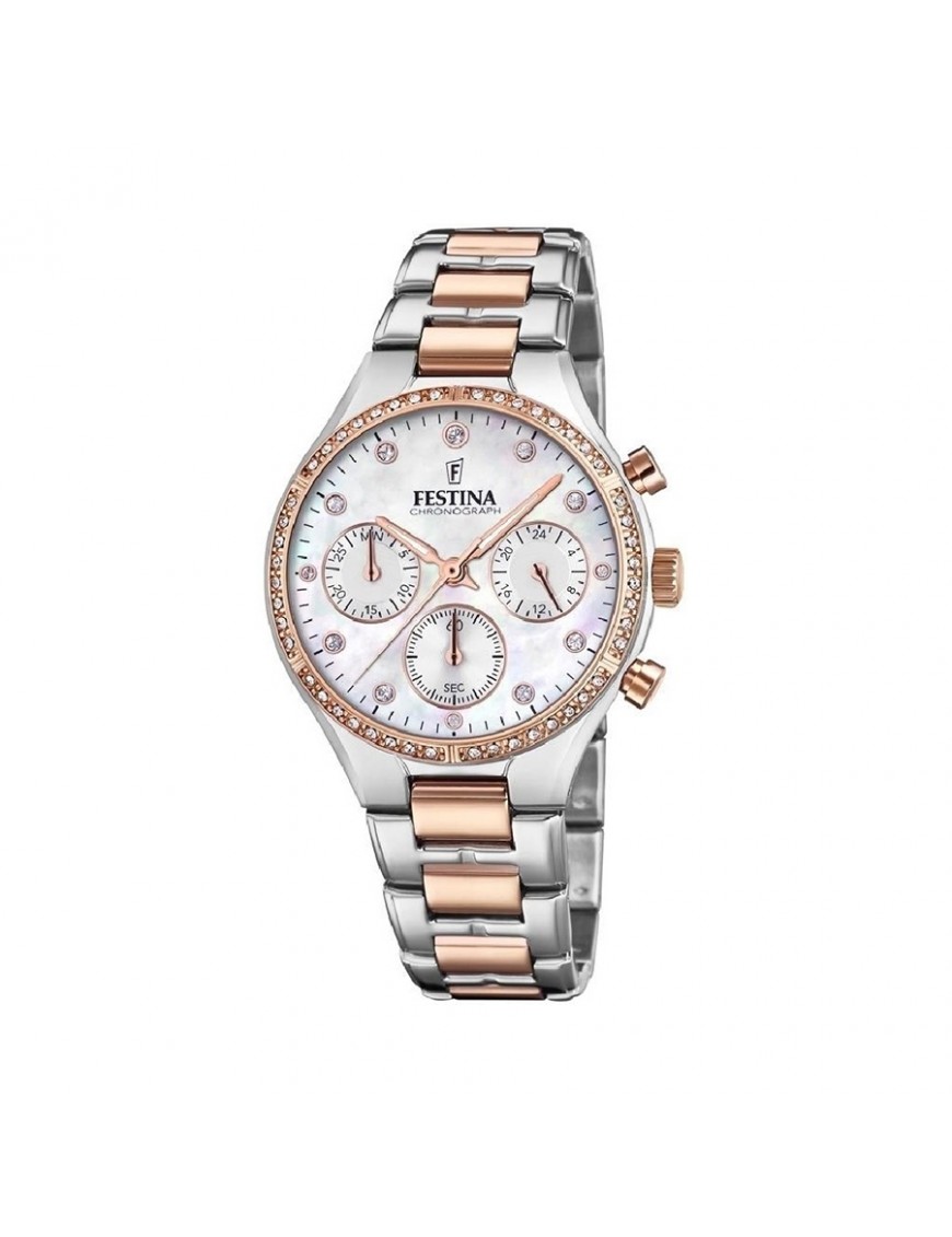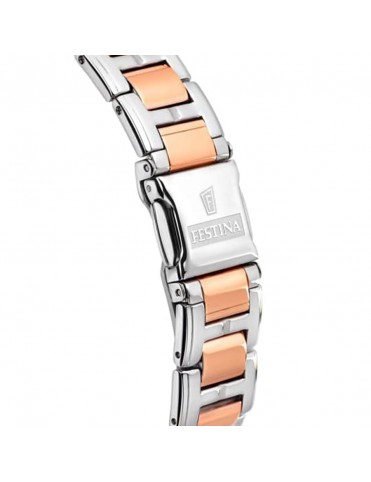 Reloj Festina Mujer Boyfriend F20403/1. Caja plateada de acero de 36mm de diámetro con bisel en color oro rosado y esfera blanca bajo un cristal mineral. La correa es de metal y cuenta con cierre de pasador. Tiene función de cronógrafo. Sumergible hasta 5 bares. Garantía de 3 años.