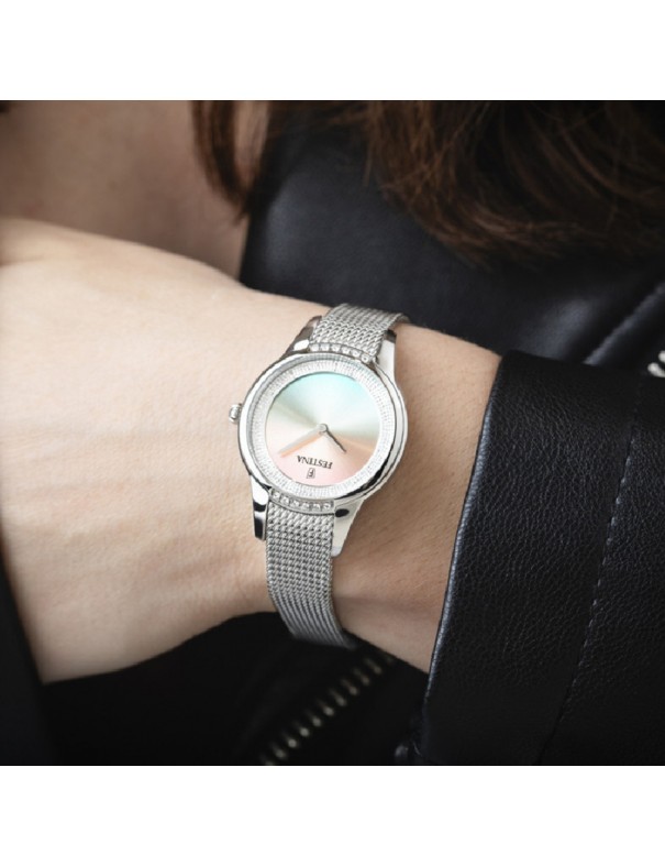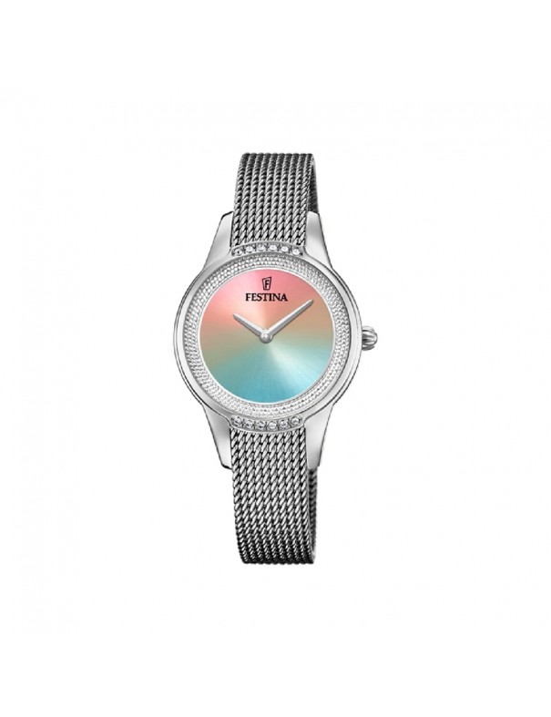 Reloj Festina Mademoiselle F20494/9. Caja de acero de 30,2mm de diámetro con cristal mineral y esfera multicolor en degradado. La correa es de acero inoxidable y tiene cierre de presión. Sumergible hasta 5 bares. Garantía de 3 años.