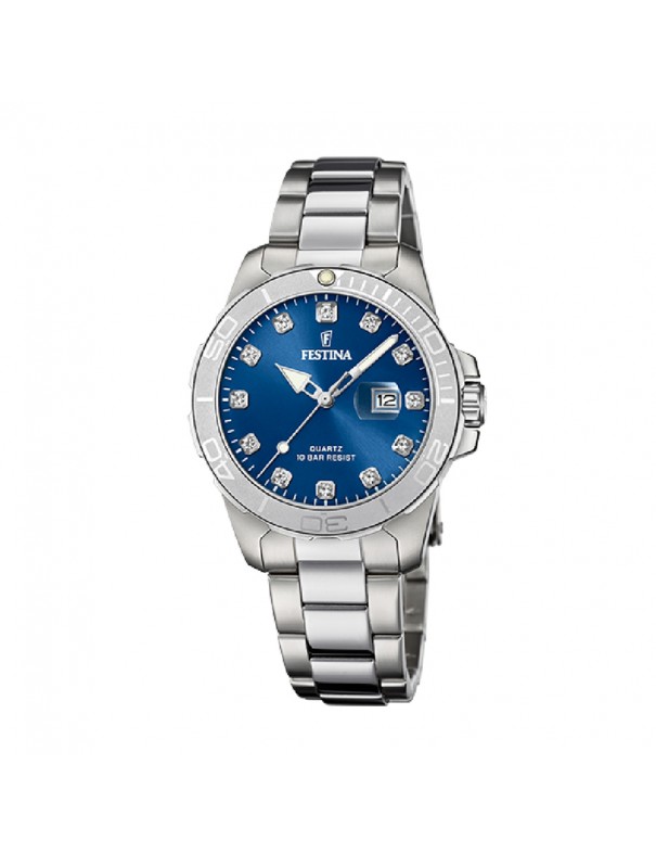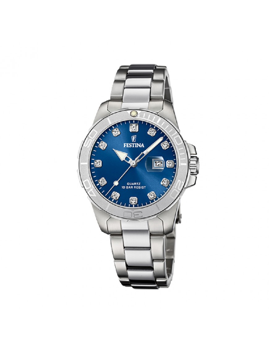 Reloj Festina Boyfriend Azul F20503/6. Caja de acero inoxidable de 34,5 mm de diámetro con esfera en color azul y tres agujas bajo un cristal mineral. La correa es de acero y cuenta con cierre desplegable. Incluye calendario. Estanqueidad de 10 ATM. Garantía de 3 años.