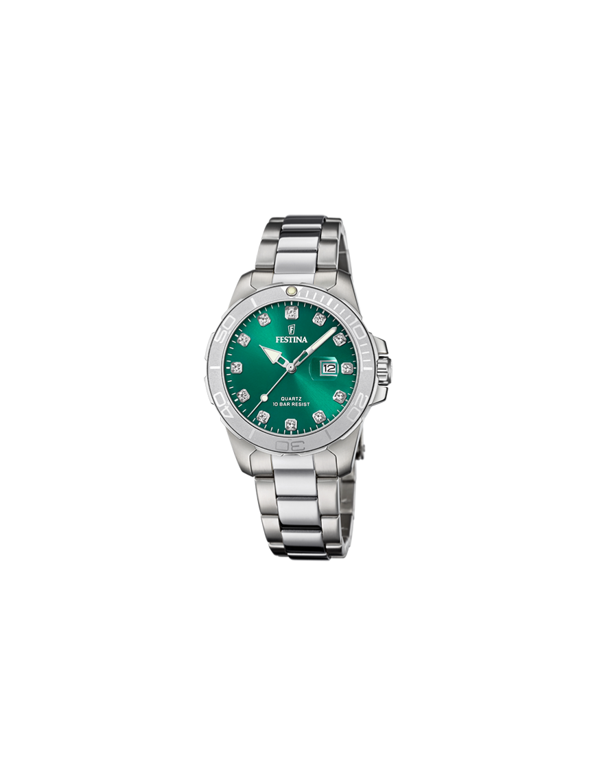 Reloj Festina Boyfriend Verde F20503/7. Caja de acero inoxidable de 34,5 mm de diámetro con esfera en color verde y tres agujas bajo un cristal mineral. La correa es de acero y cuenta con cierre desplegable. Incluye calendario. Estanqueidad de 10 ATM. Garantía de 3 años.