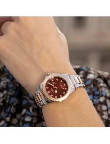 Reloj Festina Boyfriend Burdeos F20505/2. Caja de acero inoxidable de 34,5 mm de diámetro con bisel en color oro rosado y esfera en color burdeos con tres agujas bajo un cristal mineral. La correa es de acero y cuenta con cierre desplegable. Incluye calendario. Estanqueidad de 10 ATM. Garantía de 3 años.