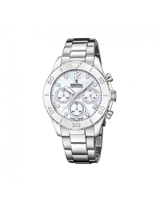 Reloj Festina Boyfriend con Esfera Beige F20603/1. Caja de acero de 39 mm de diámetro con esfera blanca y 6 agujas bajo cristal mineral. La correa es de acero y cuenta con un cierre desplegable. Tiene la función principal de cronógrafo. Estanqueidad de 10 ATM. Garantía de 3 años.