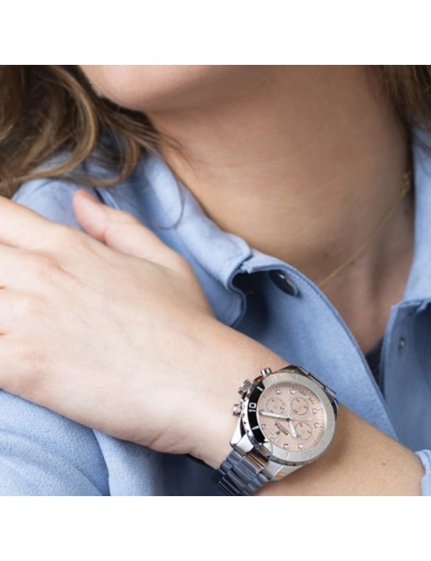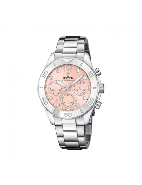 Reloj Festina Boyfriend con Esfera Rosa F20603/7. Caja de acero de 39 mm de diámetro con esfera rosa y 6 agujas bajo cristal mineral. La correa es de acero y cuenta con un cierre desplegable. Tiene la función principal de cronógrafo. Estanqueidad de 10 ATM. Garantía de 3 años.