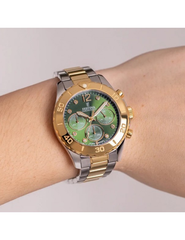 Reloj Festina Boyfriend con Esfera Verde F20604/2. Caja de acero de 39 mm de diámetro con esfera verde y 6 agujas bajo cristal mineral. La correa es de acero en dos colores, plata y dorado y cuenta con un cierre desplegable. Tiene la función principal de cronógrafo. Estanqueidad de 10 ATM. Garantía de 3 años.