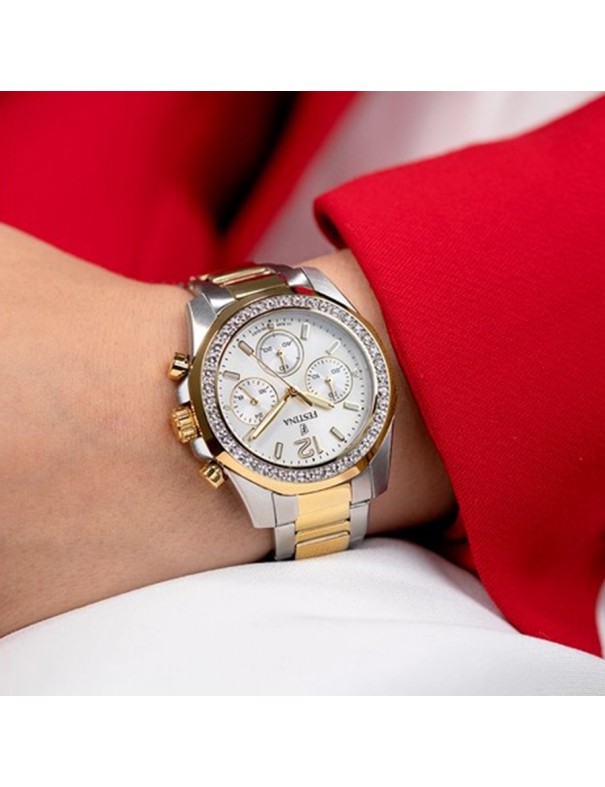Reloj Festina Rainbow con Esfera Beige F20607/1. Caja de acero de 38,1 mm de diámetro con esfera beige y 6 agujas bajo cristal mineral. La correa es de acero y cuenta con un cierre de doble pulsador. Tiene la función principal de cronógrafo. Estanqueidad de 10 ATM. Garantía de 3 años.