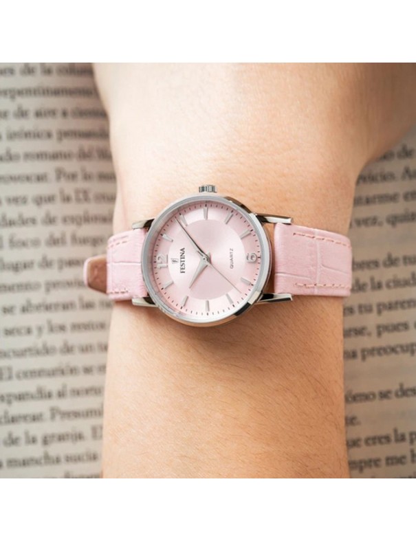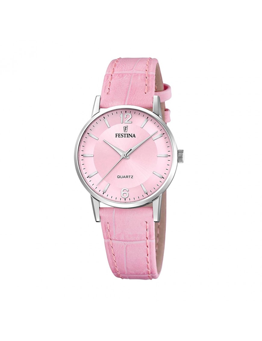 Reloj Festina Rosa Mujer F20691/3. Caja de acero de 29 mm de diámetro con esfera en color rosa bajo un cristal mineral. La correa es de piel y cuenta con cierre de hebilla. Estanqueidad de 3 ATM. Garantía de 3 años