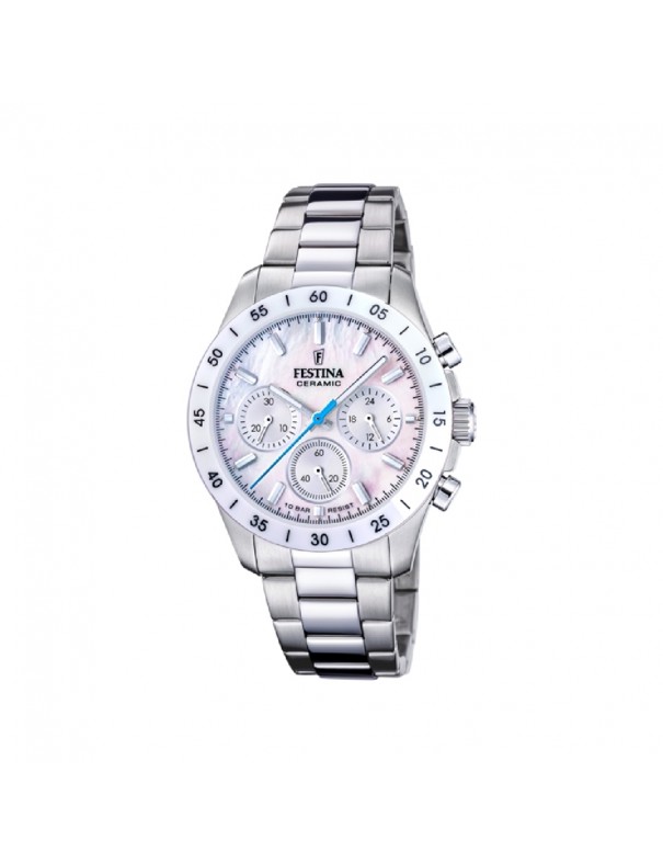Reloj Festina Cerámica F20693/1. Caja de acero de 39 mm de diámetro con esfera en color madreperla con un bisel blanco bajo un cristal mineral. La correa es de acero y tiene cierre de doble pulsador. Tiene función de cronógrafo. Estanqueidad de 10 ATM. Garantía de 3 años.