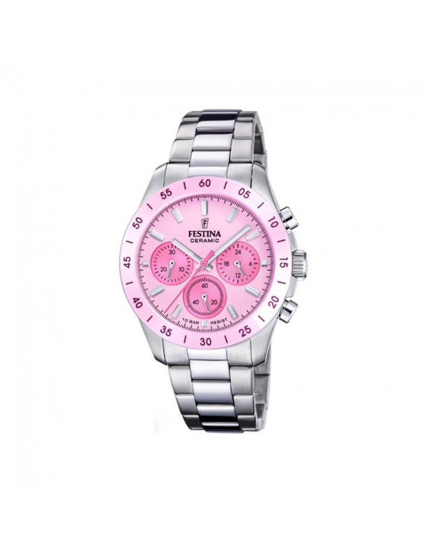 Reloj Festina Cerámica F20693/2. Caja de acero de 39 mm de diámetro con esfera y bisel en color rosa bajo un cristal mineral. La correa es de acero y tiene cierre de doble pulsador. Tiene función de cronógrafo. Estanqueidad de 10 ATM. Garantía de 3 años.