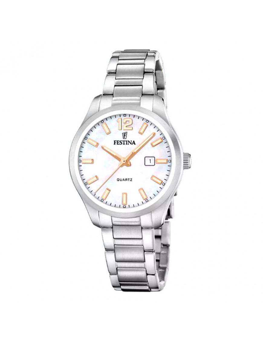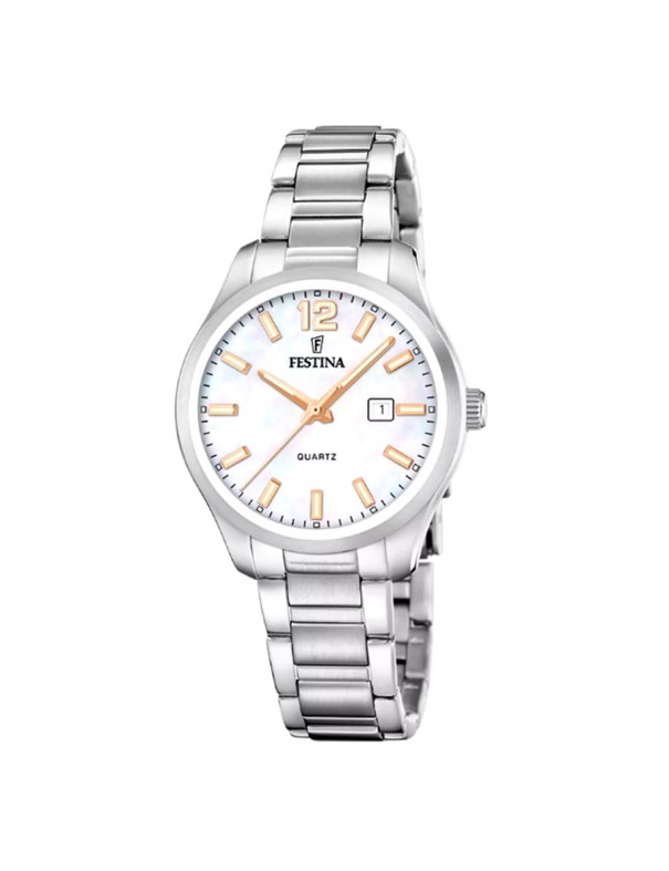 Reloj Festina Beige Mujer F20737/6. Caja y brazalete de acero inoxidable plateado y esfera de nácar con índices y agujas elegantes, que ofrece un estilo clásico y sofisticado. Incorpora movimiento de cuarzo analógico con función de fecha en ventana y cristal mineral resistente. Su brazalete metálico con cierre desplegable aporta comodidad y ajuste seguro.