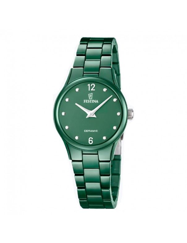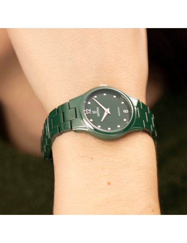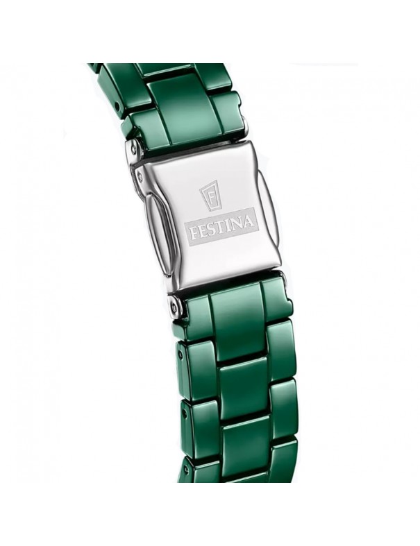 Reloj Festina Ceramic Verde F20751/6. Para mujer destaca por su elegante diseño en cerámica verde, un material resistente a los arañazos y muy ligero que aporta sofisticación y confort. Su esfera analógica combina minimalismo y modernidad, ideal tanto para looks formales como para el día a día. Incorpora movimiento de cuarzo de alta precisión y cierre seguro para mayor comodidad. Una pieza femenina que une tendencia, calidad y durabilidad.