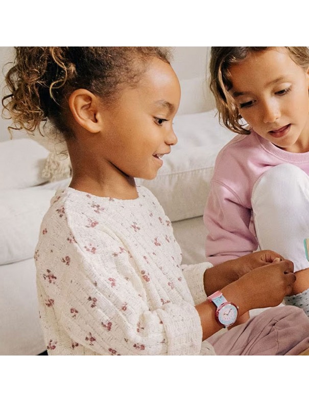 Reloj Flik Flak Sparkle Kingdom para niña FBNP214. La esfera es de plástico de origen biológico y mide 32 mm de diámetro. La pulsera es de textil reciclado con hebilla de plástico de origen biológico. No es sumergible (3ATM) y tiene tres años de garantía.