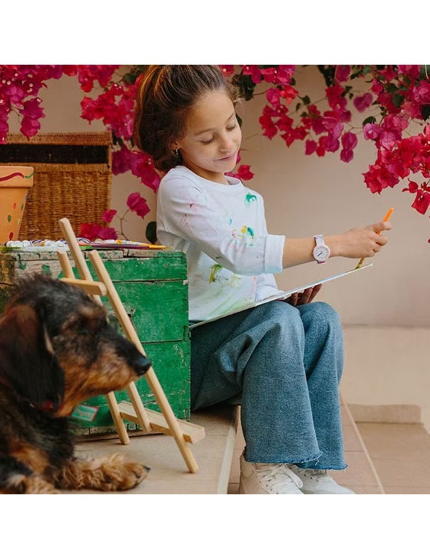 Reloj Flik Flak para niños Art Lover FPNP142. La esfera es de plástico de origen biológico como la hebilla y mide 32 mm de diámetro. La pulsera es de PET reciclado. No es sumergible (3ATM) y tiene tres años de garantía.