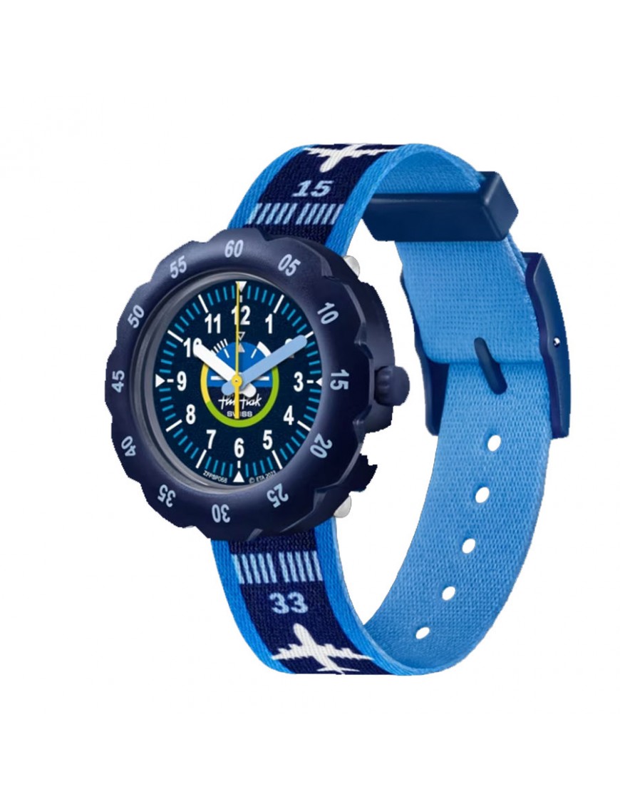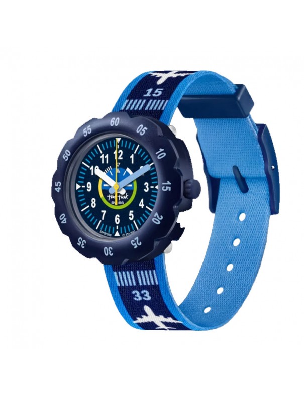 Reloj Flik Flak para niños Take Off FPSP068. La esfera es de plástico de origen biológico como la hebilla y mide 35 mm de diámetro. La pulsera es de PET reciclado. No es sumergible (3ATM) y tiene tres años de garantía.