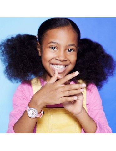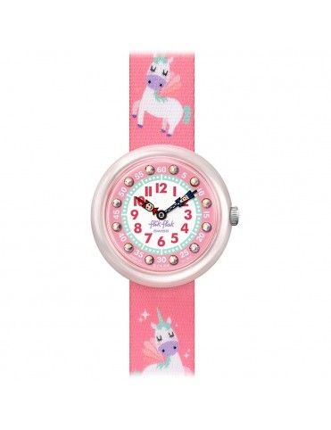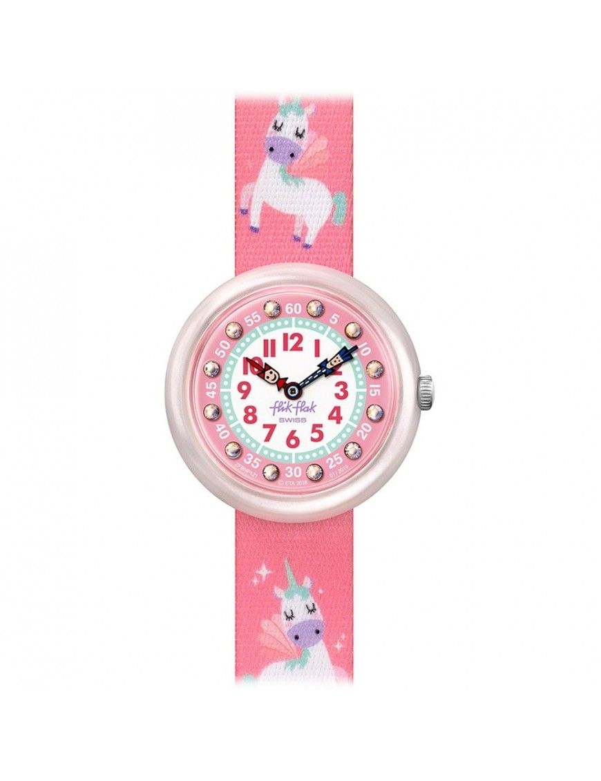 Reloj Flik Flak Magical Dream FBNP121 unicornios rosa para niñas. Es un divertido reloj analógico con tres agujas de colores. Tiene maquinaria de cuarzo protegida por un cristal plexiglás. La correa es de material textil lavable y de gran resistencia en tonos rosas con la imagen fantásticos unicornios de color rosa. El bisel semitrasparente en color rosa. El diámetro de la caja es de 31.85 milímetros. los índices horarios son números arábigos con pequeñas piedras preciosas. Tiene una resistencia de 30 metros de profundidad, 3 Bar, por lo que sólo protege de pequeñas salpicaduras de agua. Somos distribuidores oficiales de los relojes Flik & Flak que tiene una garantía de 2 años contra defectos de fabricación. Enviamos nuestros artículos en un envoltorio especial para regalo