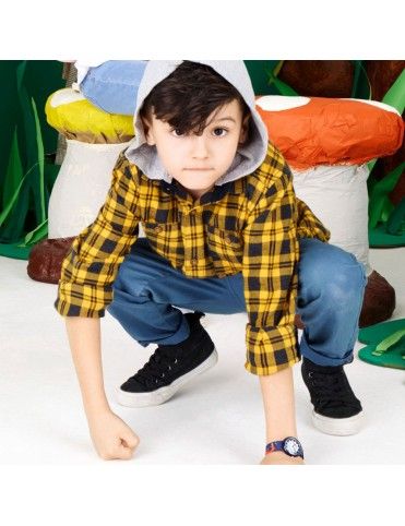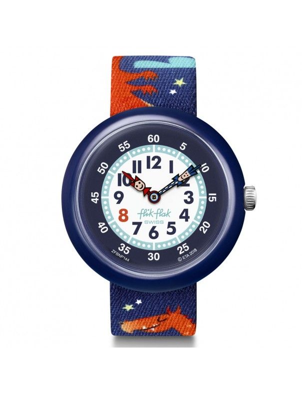 Reloj Flik Flak Niño Draggy FBNP144, analógico sin segundero. Esfera de 31mm de diámetro. Caja de plástico y pulsera de material textil. Sumergible a 3ATM, por lo que sólo soporta pequeñas salpicaduras.