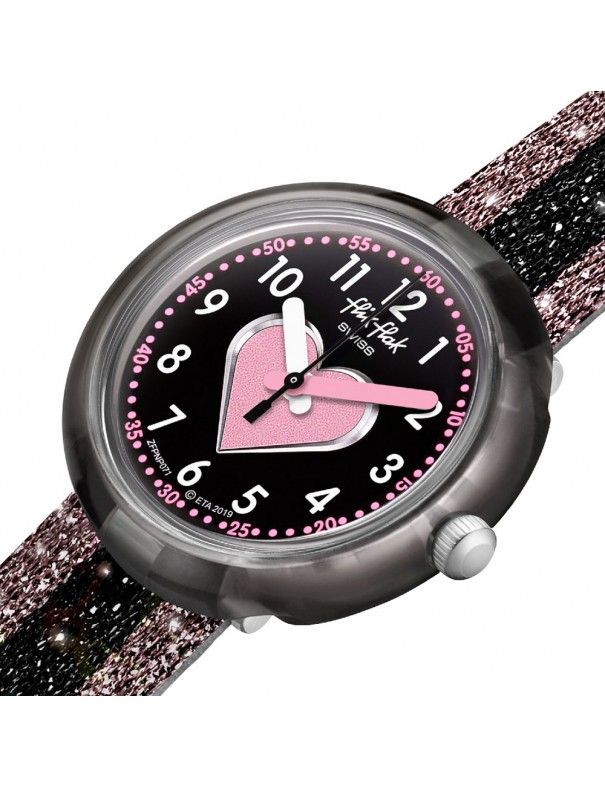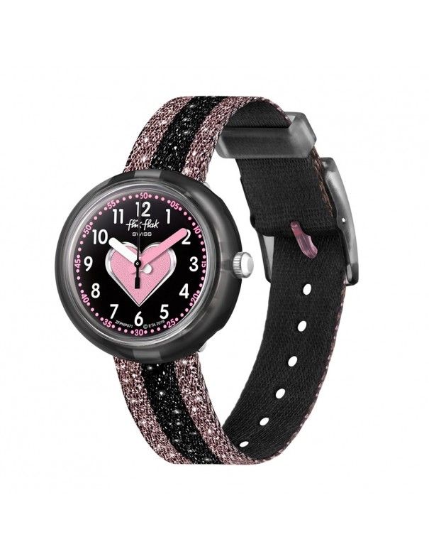 Reloj Flik Flak Niña Cuoricino FPNP071, analógico con segundero. Esfera de 31mm de diámetro. Caja de plástico y pulsera de material textil. Sumergible a 3ATM, por lo que sólo soporta pequeñas salpicaduras.