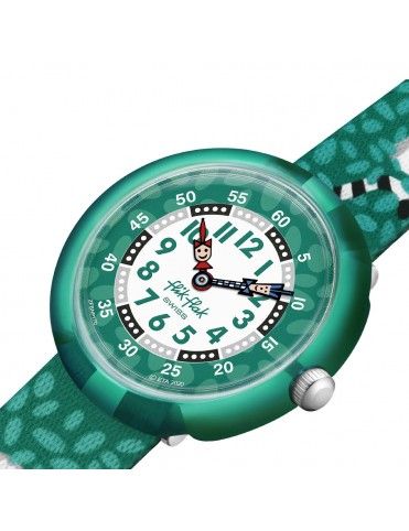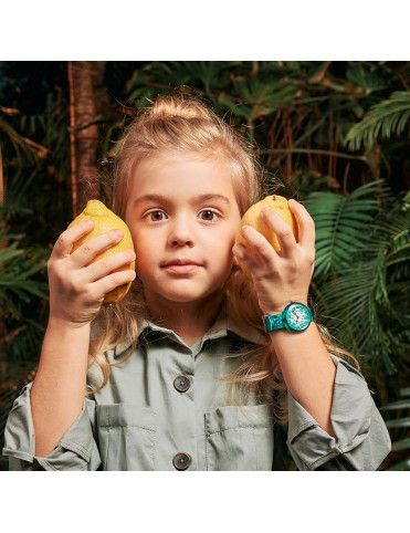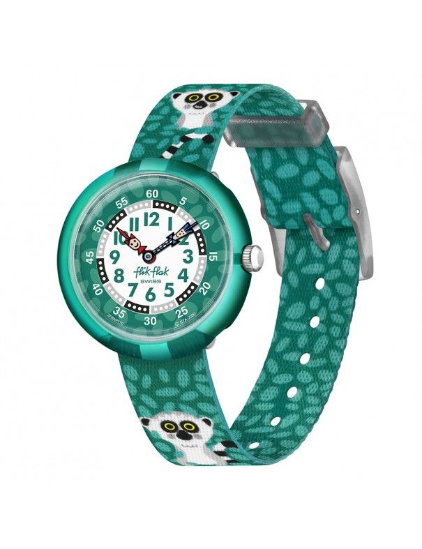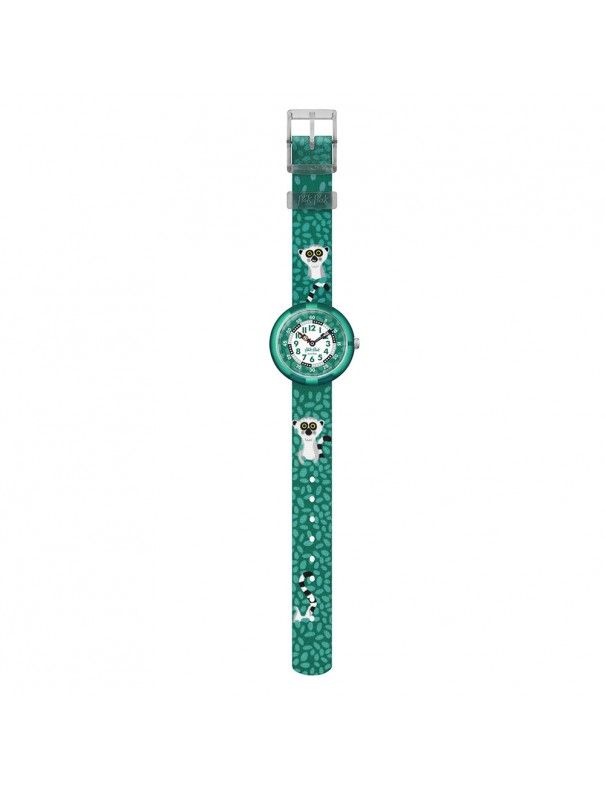 Reloj Flik Flak Niño Curius Lemur FBNP170, analógico sin segundero. Caja de 30mm de diámetro de plástico y pulsera de material textil. Sumergible a 3ATM, por lo que sólo soporta pequeñas salpicaduras.