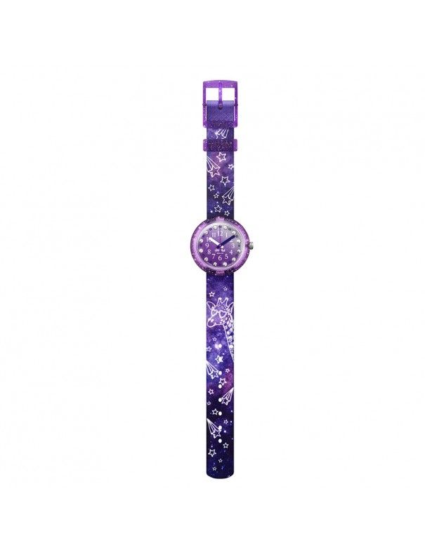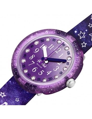 Reloj Flik Flak Niña Giraxus FPNP080, analógico con segundero. Esfera de 30mm de diámetro de plástico decorada en su interior con circonitas. Pulsera de material textil. Sumergible a 3ATM, por lo que sólo soporta pequeñas salpicaduras.