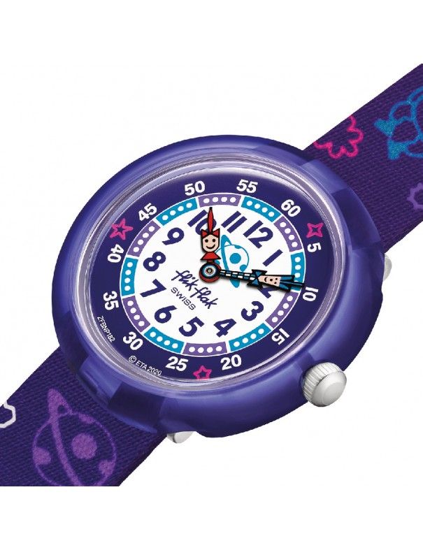 Reloj Flik Flak Plan It FBNP182, analógico sin segundero. Caja de plástico con origen biológico de 32mm de diámetro. Pulsera Pet reciclado. Cierre de plástico con origen biológico. Sumergible a 3ATM, por lo que sólo soporta pequeñas salpicaduras.