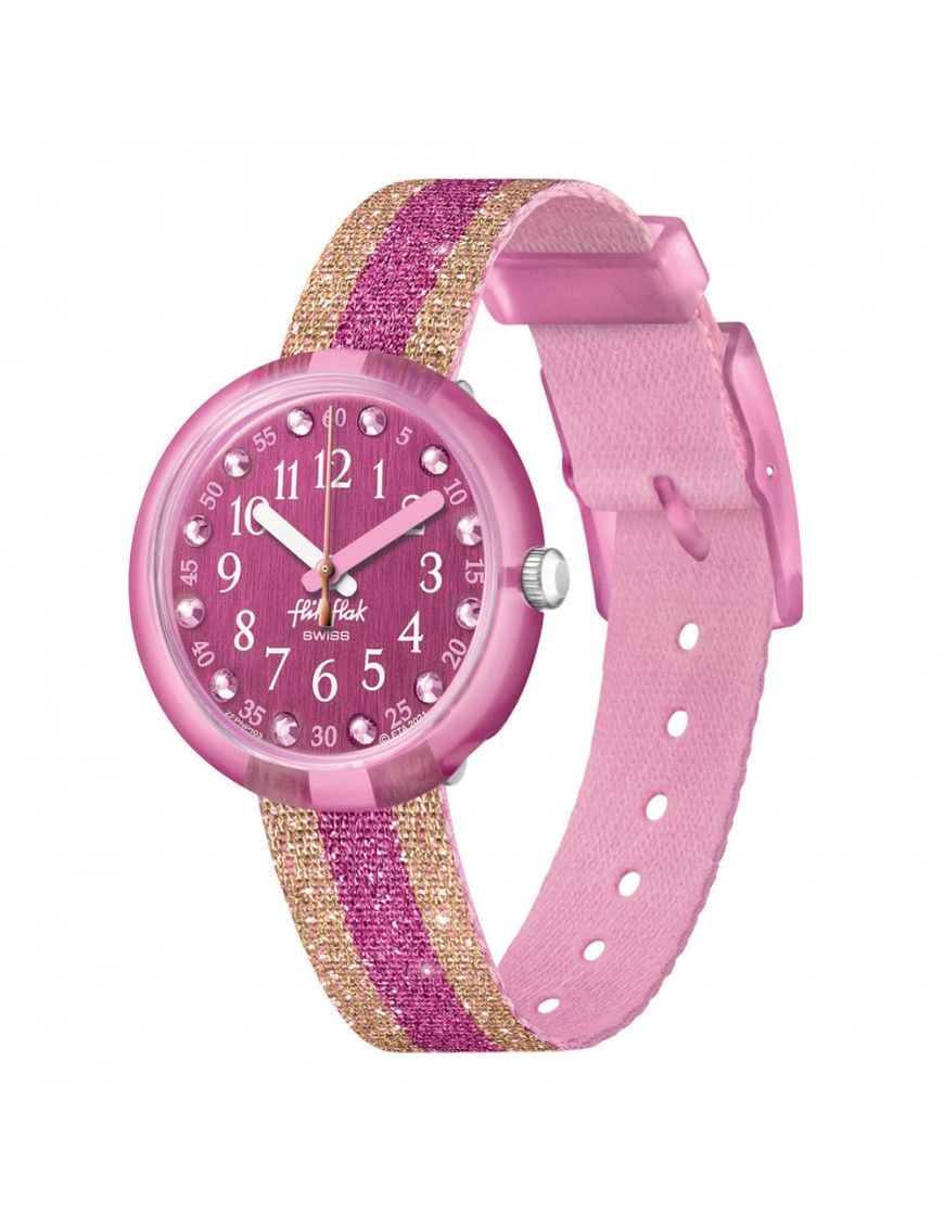 Reloj Flik Flak Shine In Pink FPNP105, analógico con segundero. Caja de material con origen biológico de 32mm de diámetro. Pulsera Pet reciclado. Sumergible a 3ATM, por lo que sólo soporta pequeñas salpicaduras.