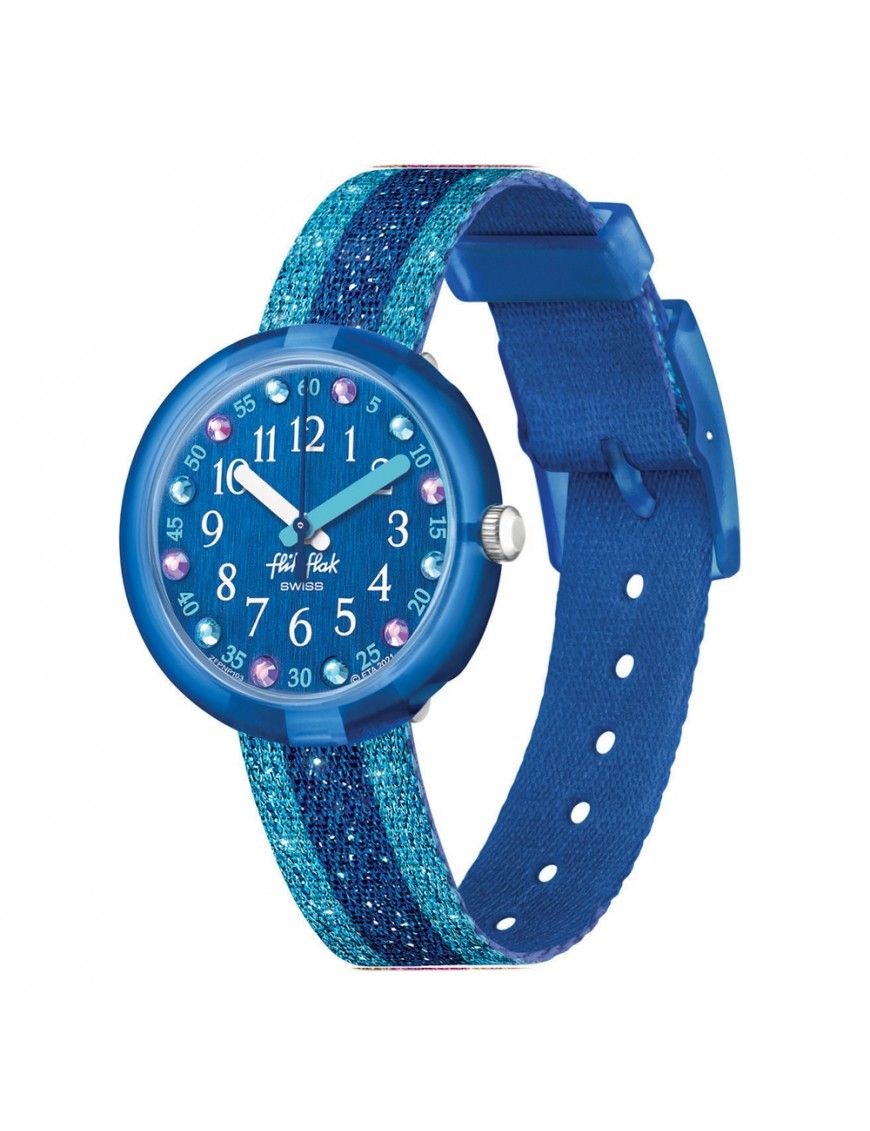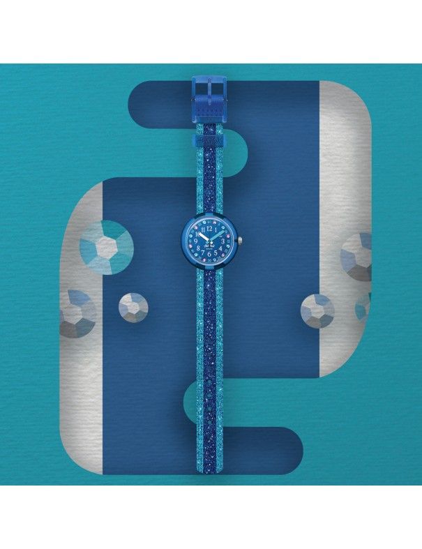 Reloj Flik Flak Shine In Blue FPNP103, analógico con segundero. Caja de material con origen biológico de 32mm de diámetro. Pulsera Pet reciclado.