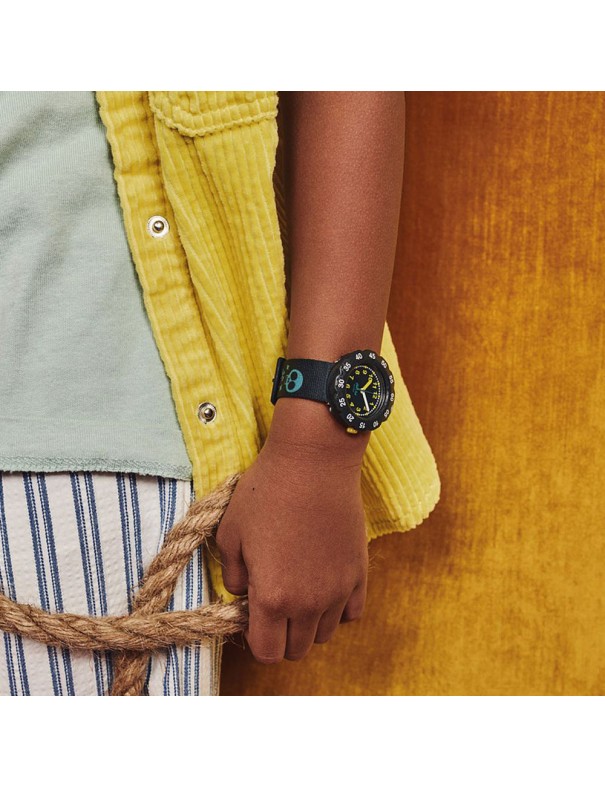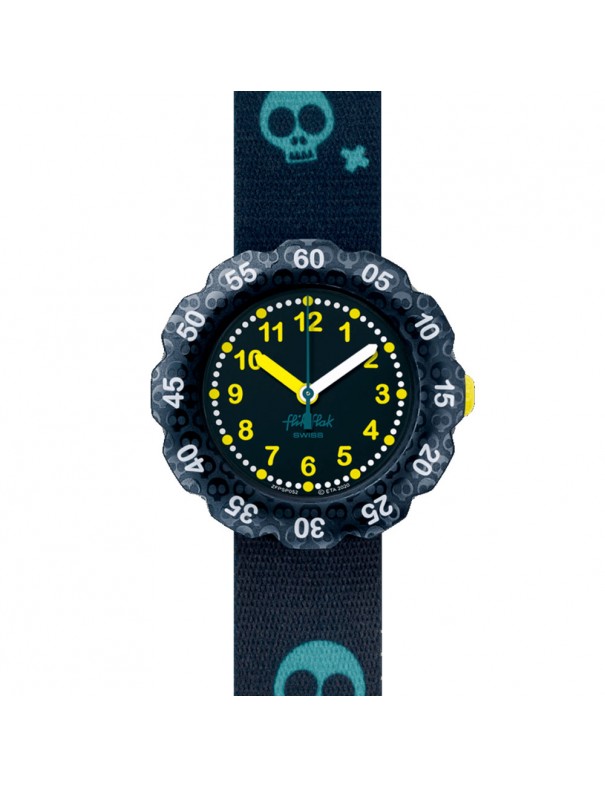 Reloj Flik Flak Skeleticious FPSP052, analógico de tres agujas. Caja de plástico de 34.75mm de diámetro. Pulsera Pet reciclado. Sumergible a 3ATM, por lo que sólo soporta pequeñas salpicaduras.