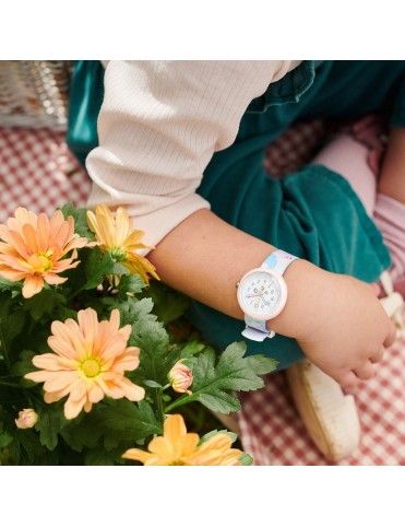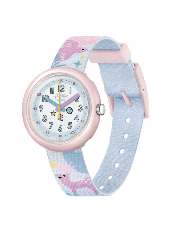 Reloj Flik Flak Magical Forest FPNP030C, analógico de tres agujas. Caja de plástico de 32mm de diámetro. Pulsera Pet reciclado. Sumergible a 3ATM, por lo que sólo soporta pequeñas salpicaduras.