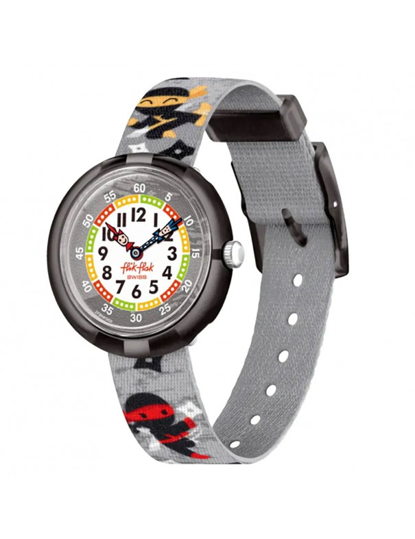 Reloj Flik Flak Wakuwaku FBNP203, analógico de dos agujas. Caja de plástico de 30mm de diámetro. Pulsera Pet reciclado. Sumergible a 3ATM, por lo que sólo soporta pequeñas salpicaduras.