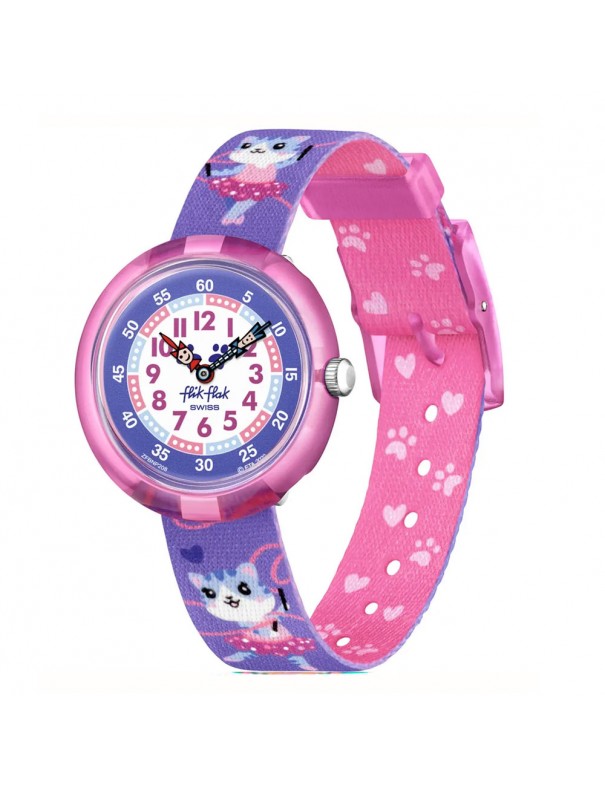 Reloj Flik Flak Ballerichat FBNP208, analógico de dos agujas. Caja de plástico de 30mm de diámetro. Pulsera Pet reciclado. Sumergible a 3ATM, por lo que sólo soporta pequeñas salpicaduras.
