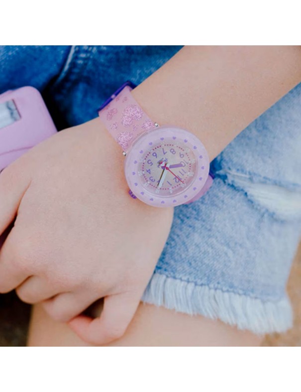 Reloj para niña Flik Flak Lovaxus FCSP115. La esfera y la hebilla son de plástico biológico y la correa de PET (plástico) reciclado. La esfera mide 37 mm de diámetro. Garantía de tres años.