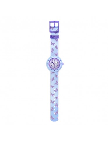 Reloj para niña Flik Flak Farfallaxus FCSP119. La esfera y la hebilla son de plástico biológico y la correa es de PET (plástico) reciclado. La esfera mide 37 mm de diámetro. Garantía de tres años.