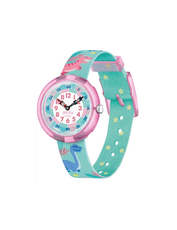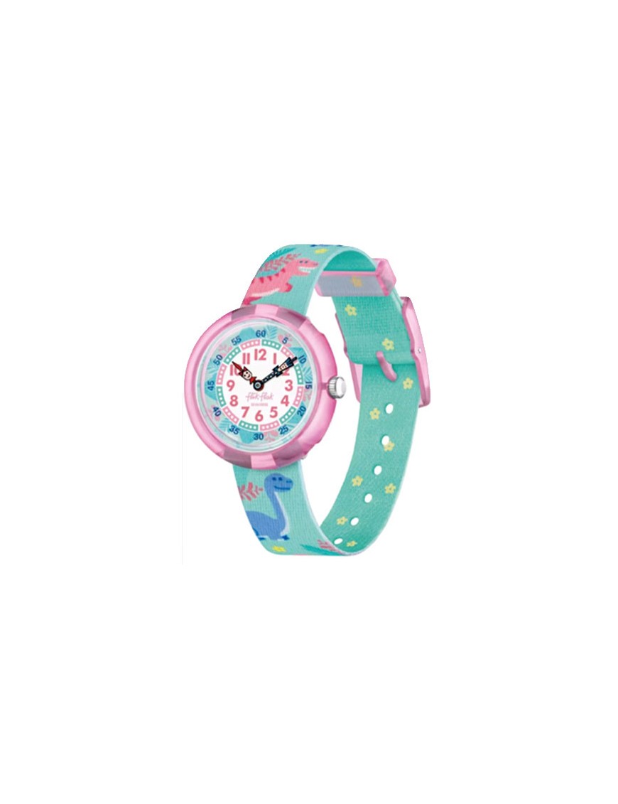 Reloj Flik Flak Dino Party FBNP212, analógico de dos agujas. Caja de plástico de origen biológico. Pulsera Pet reciclado. Sumergible a 3ATM, por lo que sólo soporta pequeñas salpicaduras.