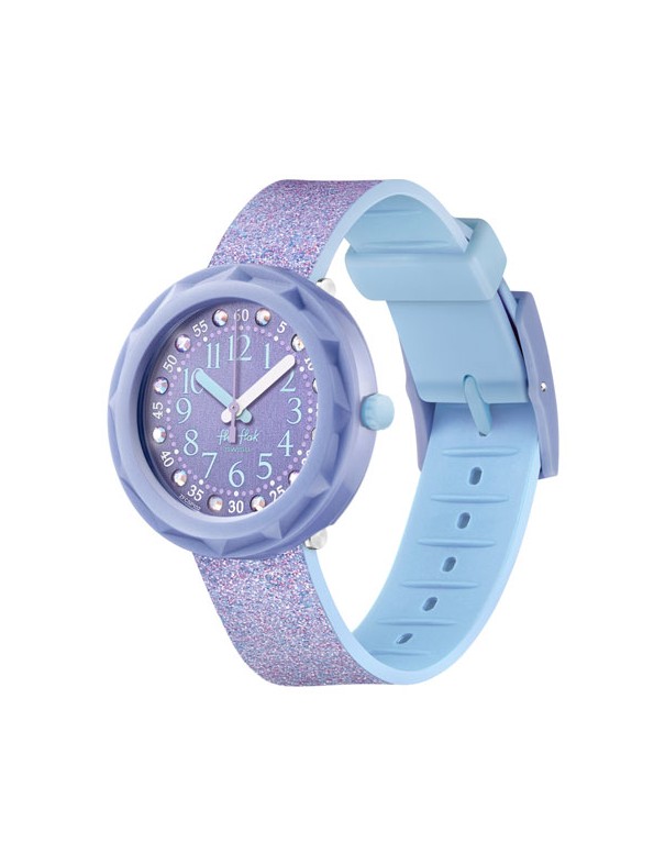 Reloj Flik Flak Lilaxus FCSP102, analógico de tres agujas. Caja de plástico de origen biológico. Diámetro de 37mm. Pulsera Pet reciclado. Sumergible a 3ATM, por lo que sólo soporta pequeñas salpicaduras.