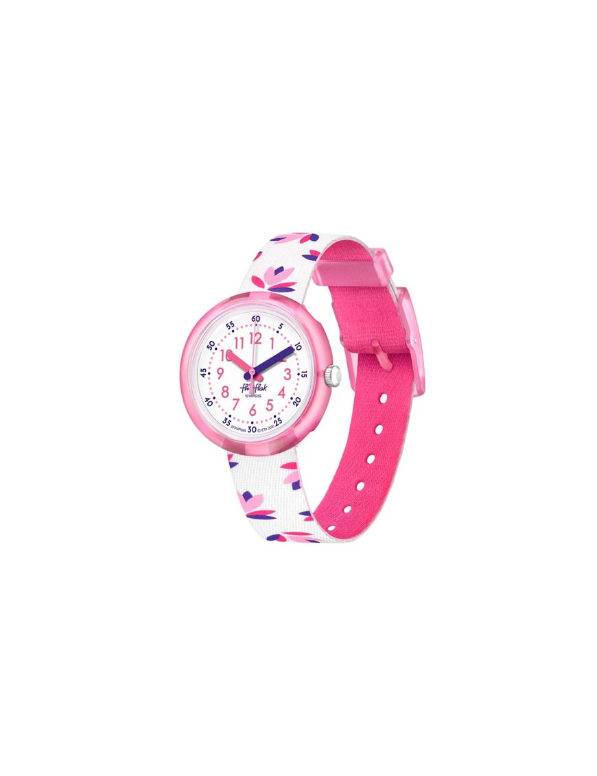 Reloj Flik Flak Marinette FPNP095, analógico de tres agujas. Caja de plástico de origen biológico. Diámetro de 32mm. Pulsera Pet reciclado. Sumergible a 3ATM, por lo que sólo soporta pequeñas salpicaduras.