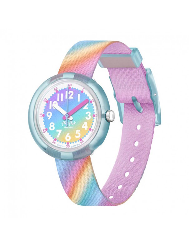 Reloj Flik Flak Para Niños Liquid Rainbow FPNP152. La esfera es de plástico de origen biológico como la hebilla y mide 32 mm de diámetro. La pulsera es de PET reciclado. No es sumergible (3ATM) y tiene tres años de garantía.
