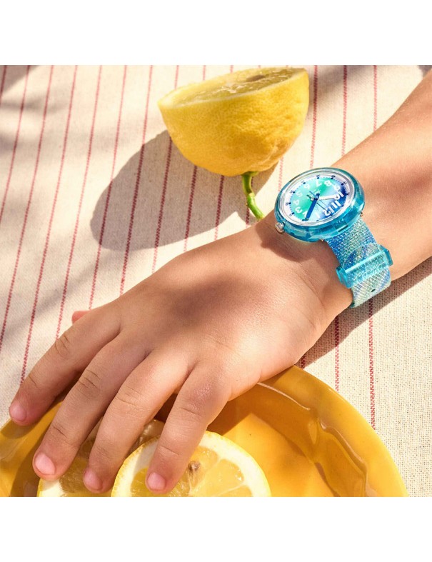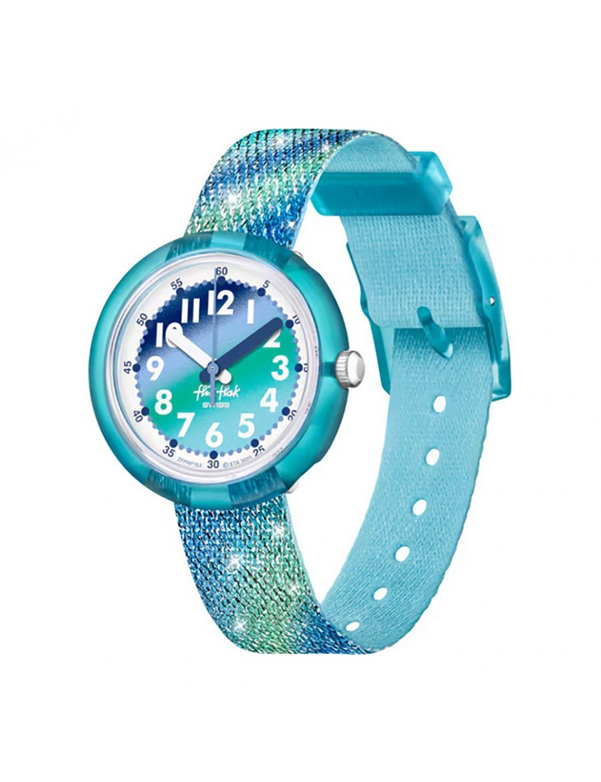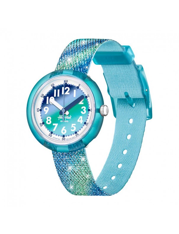 Reloj Flik Flak Para Niños Frozen Rainbow FPNP153. La esfera es de plástico de origen biológico como la hebilla y mide 32 mm de diámetro. La pulsera es de PET reciclado. No es sumergible (3ATM) y tiene tres años de garantía.