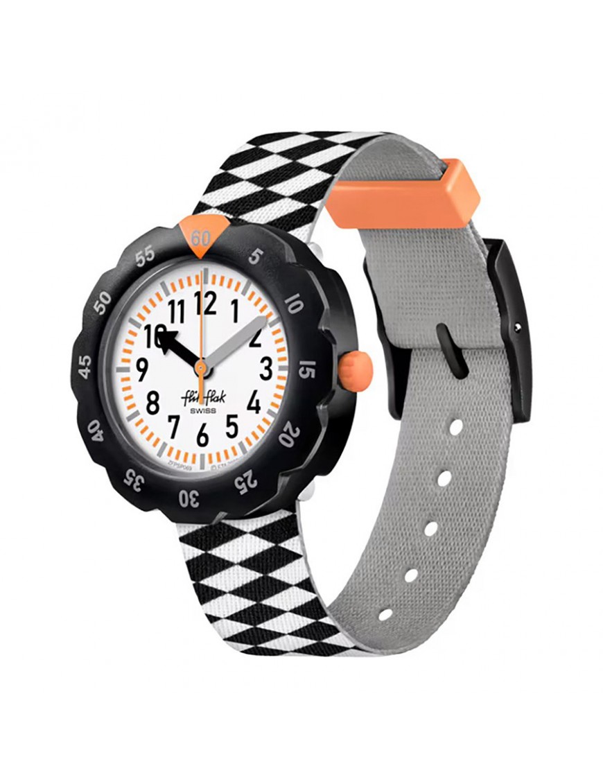 Reloj Flik Flak Para Niño Race Flag FPSP069. La esfera es de plástico de origen biológico como la hebilla y mide 35 mm de diámetro. La pulsera es de PET reciclado. No es sumergible (3ATM) y tiene tres años de garantía.
