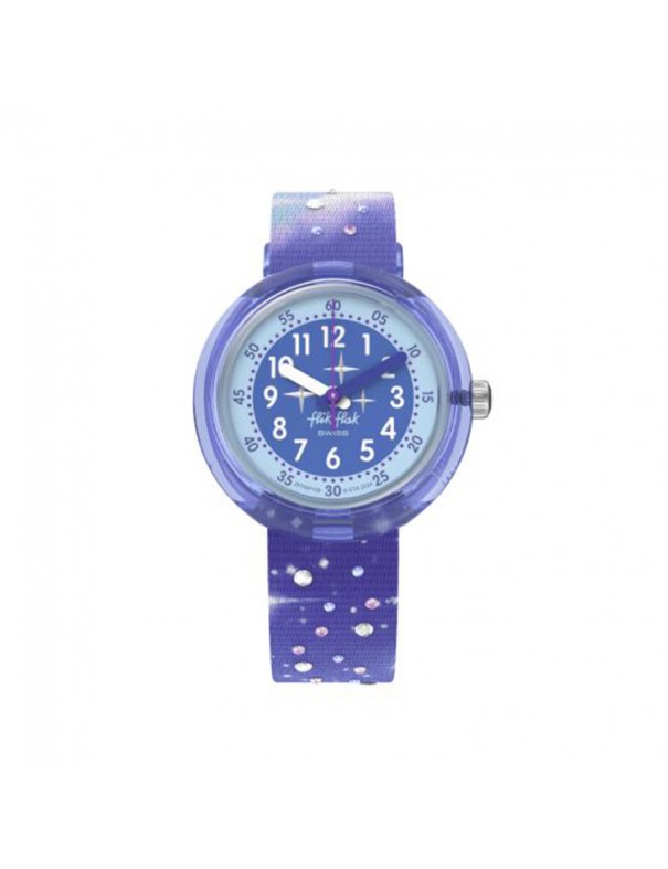 Reloj Flik & Flak Mystic Clouds FPNP158. Esfera con estrellas grabadas y piedras de cristal. La correa tiene un diseño de nubes en color morado y azul. El cierre es de hebilla. Sumergible hasta 3 bares. Garantía de 3 años.