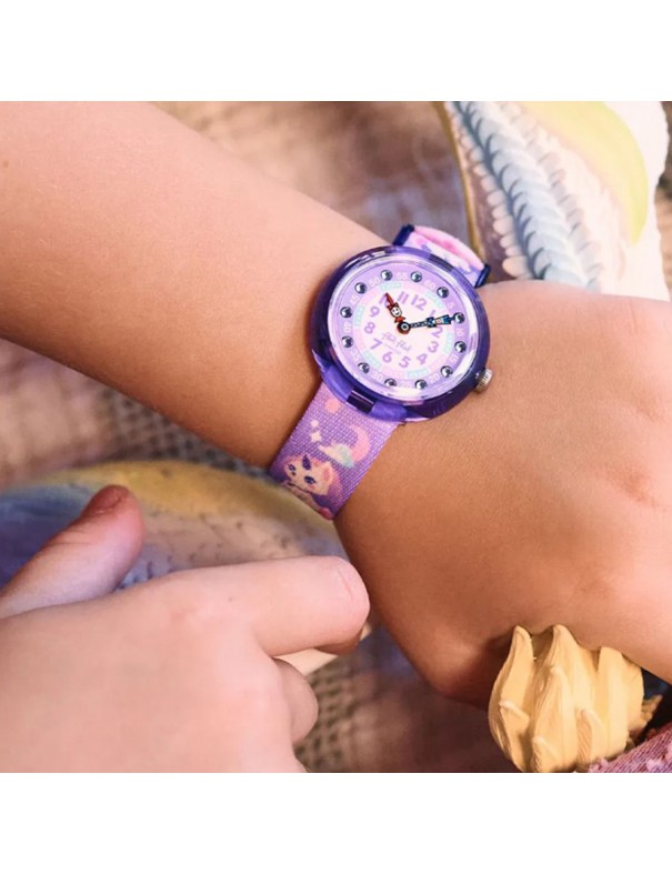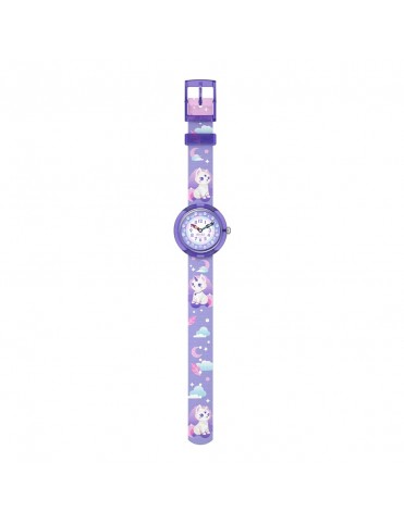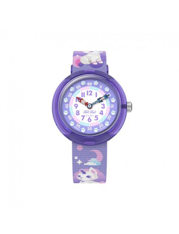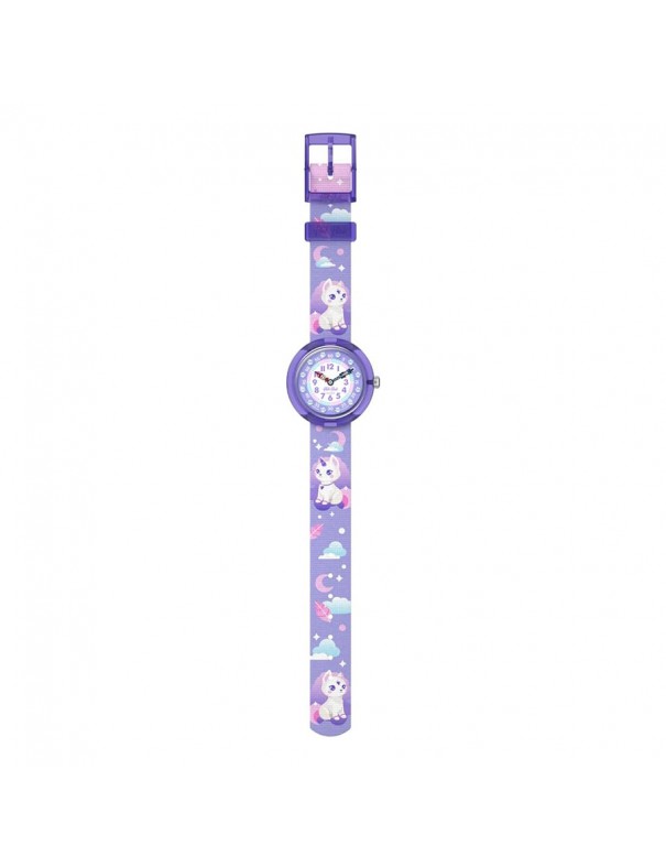 Reloj Flik Flak Cosmicat FBNP233. Esfera blanca y morad con piedras de cristal. La correa está decorada con gatos unicornios en un cielo de nubes moradas. Sumergible hasta 3 bares. Garantía de 3 años.