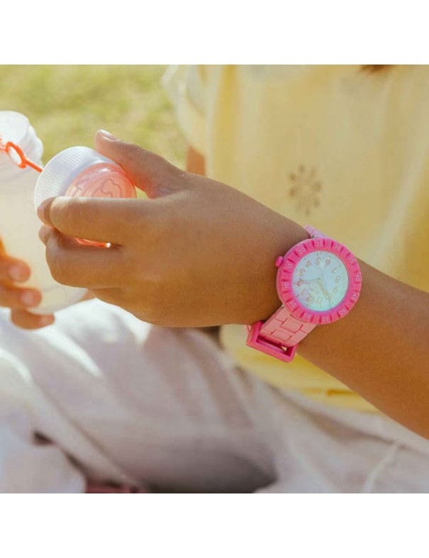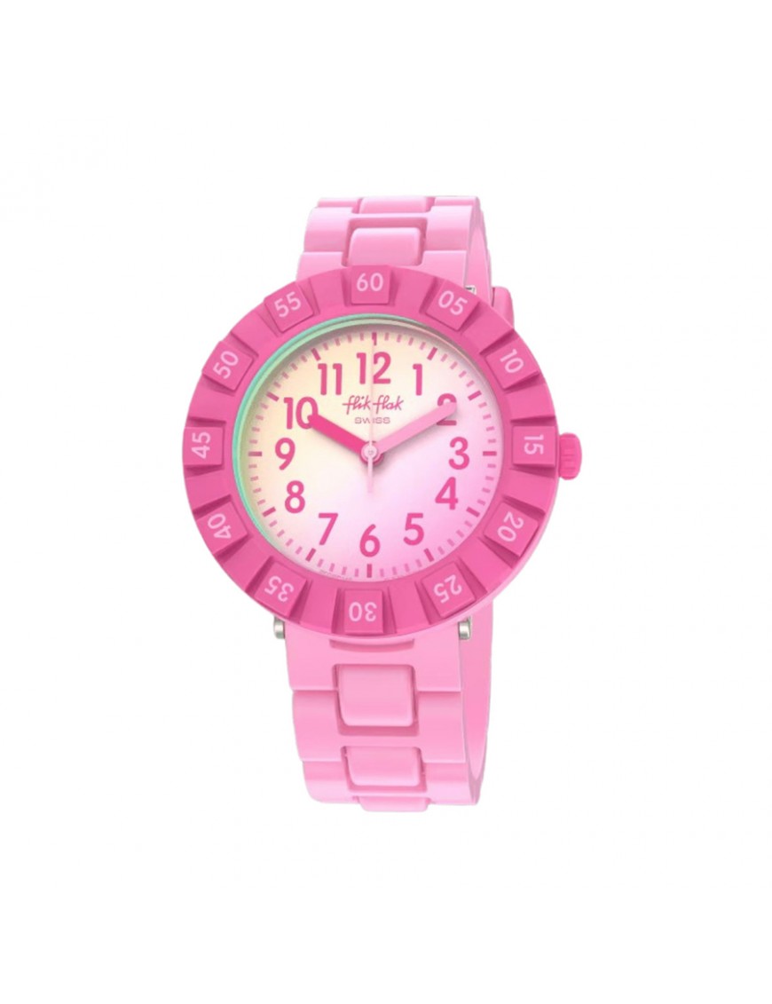 Reloj Flik Flak Pink Splash FCSP125. Reloj entero en color rosa con cristal haciendo un efecto de solar espectrum. Sumergible hasta 3 bares. Garantía de 3 años.