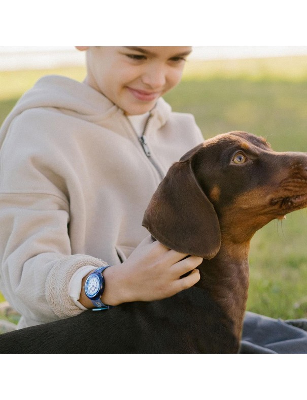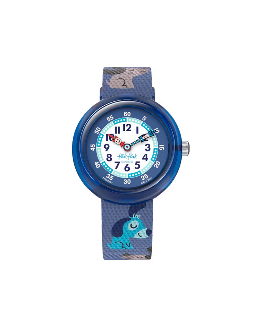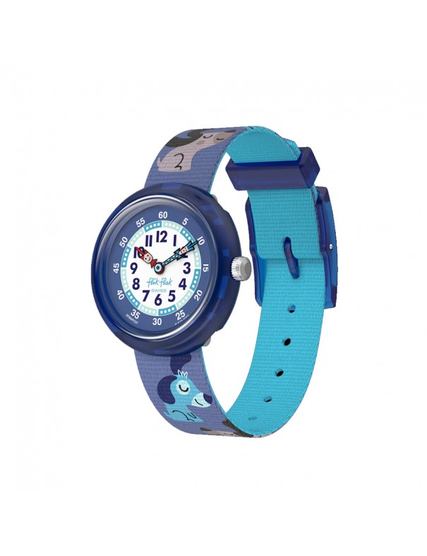 Reloj Flik Flak Cutie Puppy FBNP237. Esfera en azul y blanca cubierta por una caja azul transparente. La correa está decorada con perros sobre un fondo azul. Sumergible hasta 3 bares. Garantía de 3 años.