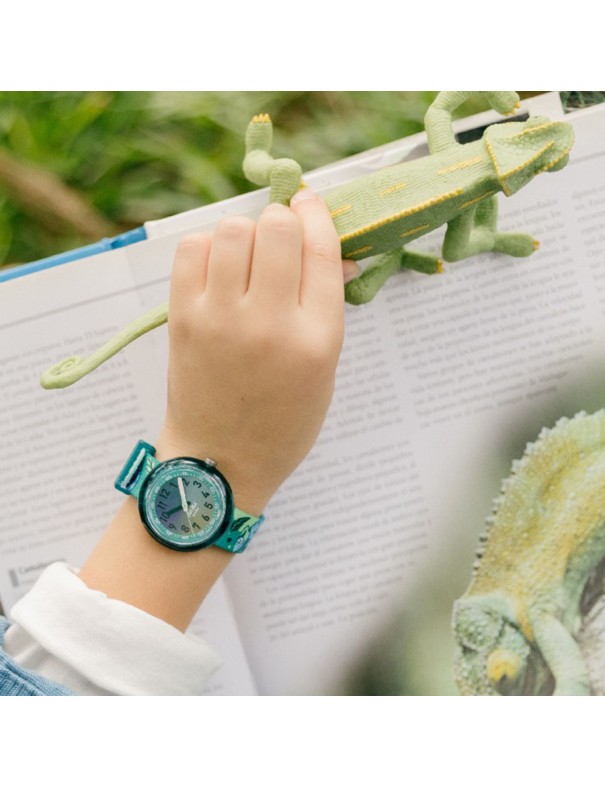 Reloj Flik Flak Camo Friends FPNP161. Esfera en degradado de verdes con caja en verde transparente. La correa es verde y está decorada con camaleones. Sumergible hasta 3 bares. Garantía de 3 años.