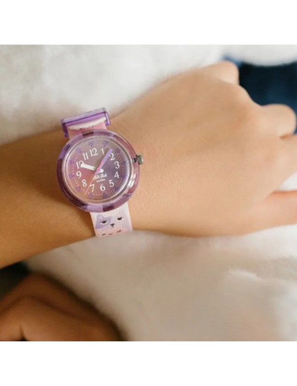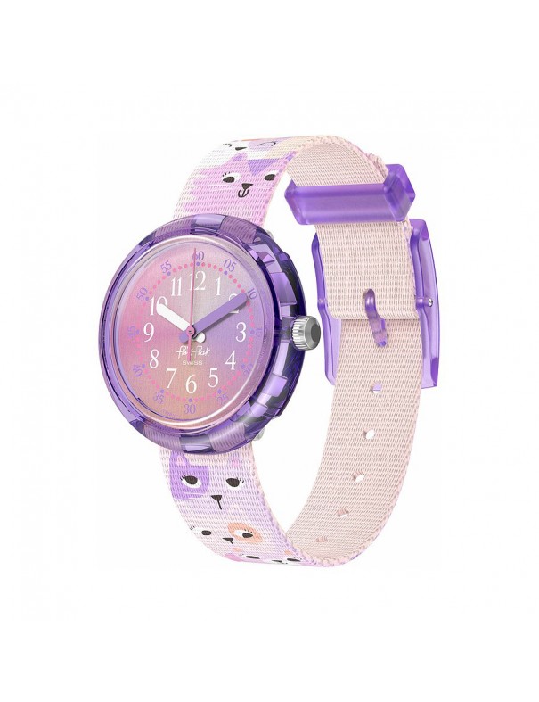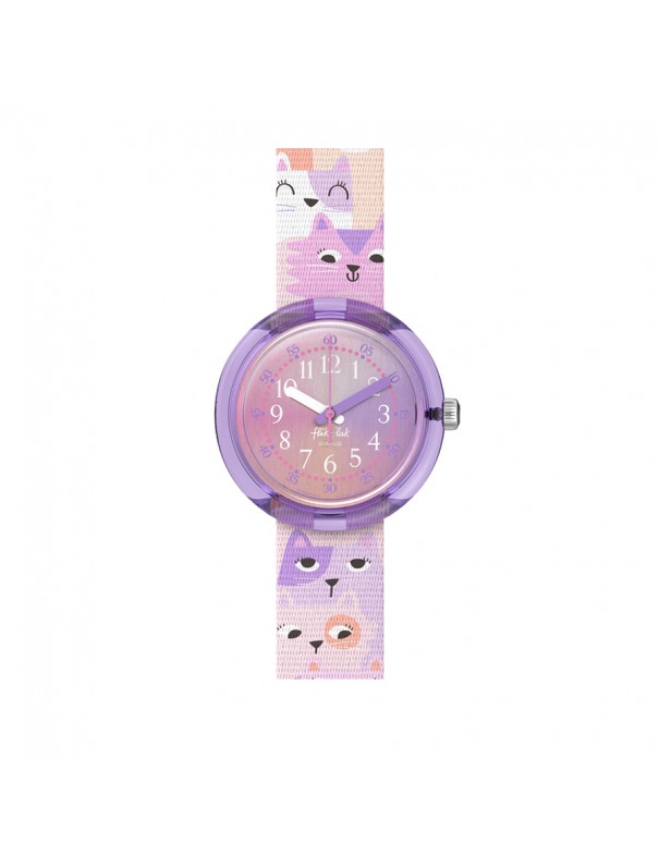 Reloj Flik Flak Cutie Kitty FPNP162. Esfera en degradado de rosa y morado con caja en morado transparente. La correa está decorada con gatitos. Sumergible hasta 3 bares. Garantía de 3 años.
