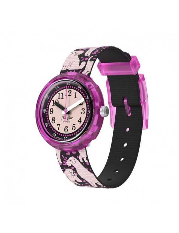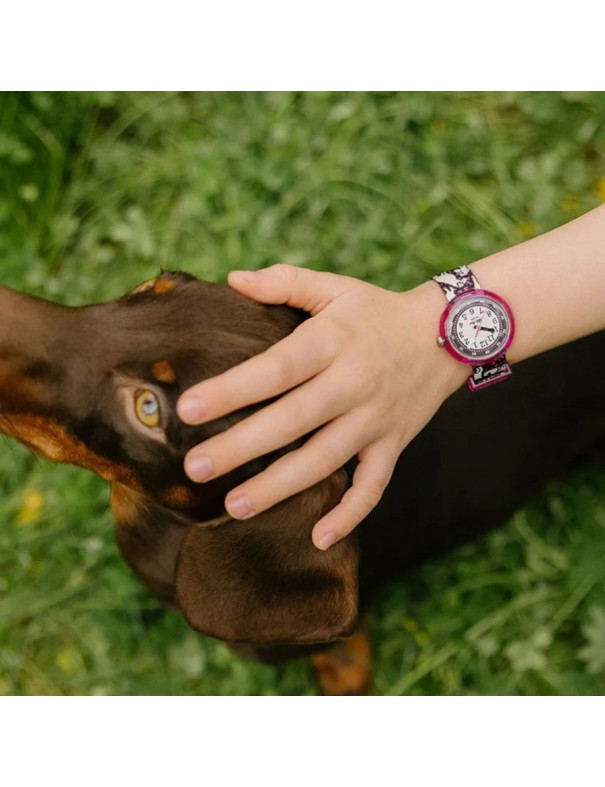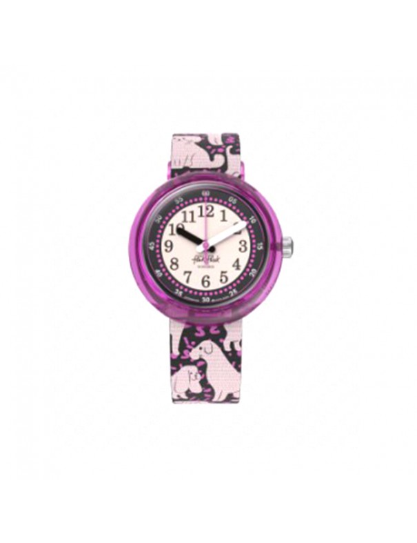 Reloj Flik Flak Woof Woof Time FPNP163. Esfera en rosa claro y negro con caja en morado transparente. La correa está decorada con perros sobre fondo negro. Sumergible hasta 3 bares. Garantía de 3 años.