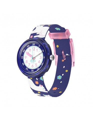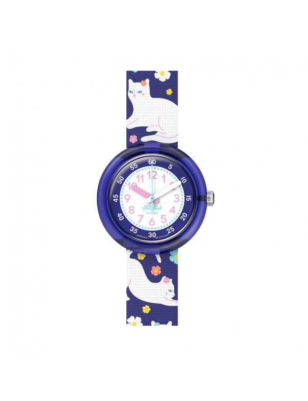 Reloj Flik Flak Fancy Cat FPNP164. Esfera en color blanco y azul con caja en azul oscuro transparente. La correa está decorada con gatitos sobre fondo azul oscuro. Sumergible hasta 3 bares. Garantía de 3 años.