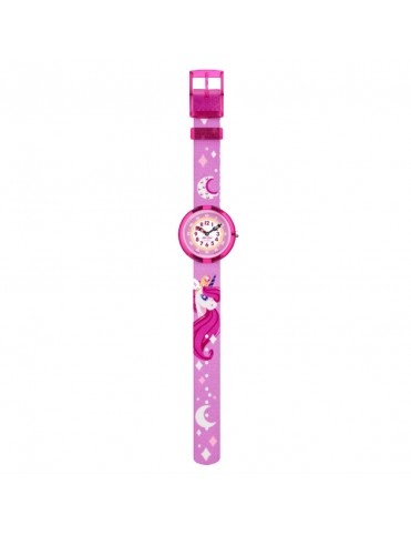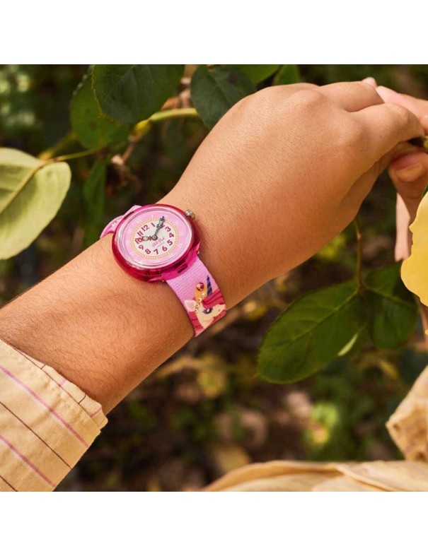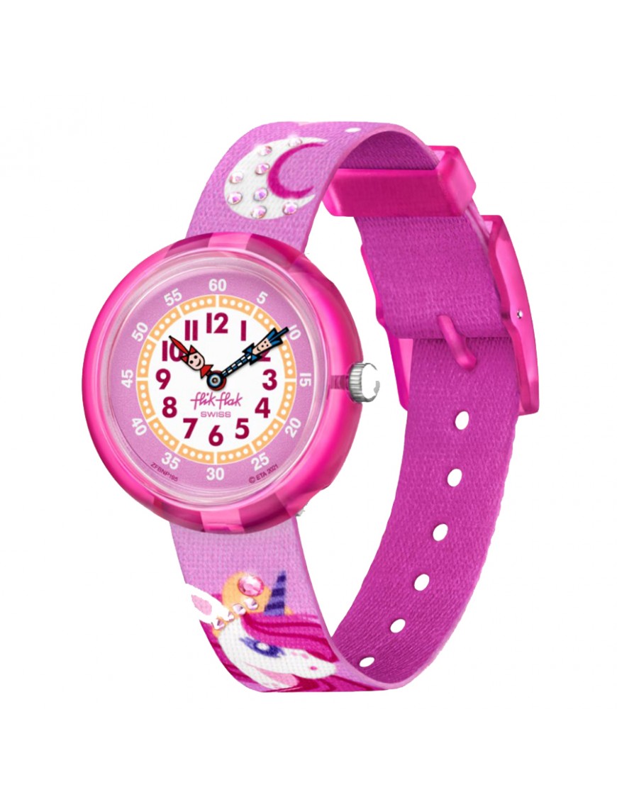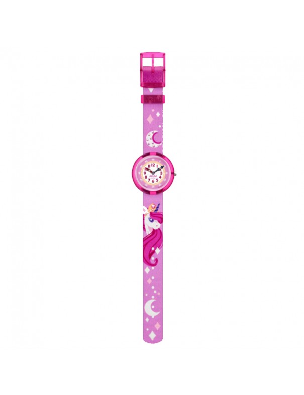 Reloj FLIK FLAK Dreaming Unicorn FBNP195. Cuenta con caja de plástico de origen biológico en color rosa y esfera blanca y rosa. Correa de textil reciclado con cierre de hebilla. Movimiento de cuarzo suizo con funciones básicas de hora. Resistencia al agua de 3 bar.