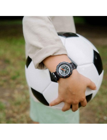 Reloj FLIK FLAK Goal FPSP064. Cuenta con caja de plástico de origen biológico en color negro y esfera negra con números blancos. Correa textil reciclada con diseño futbolístico y cierre de hebilla. Movimiento de cuarzo suizo analógico. Resistente al agua hasta 3 bar. Garantía de 3 años.